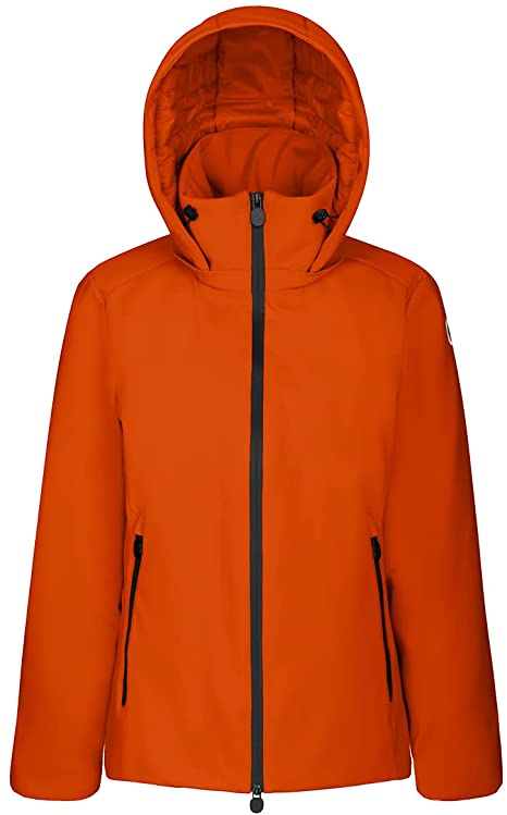 Giubbino donna con cappuccio, in tessuto bonded, 82% poliammide, 18% spandex, imbottito, non trapuntato. Fodera in tinta trapuntata orizzontalmente. Allacciatura centro davanti e tasche con lampo spalmata opaca colore nero. Cappuccio staccabile e regolabile con coulisse elastica. Bretelle staccabili personalizzate, che permettono di indossare il capo come se fosse uno zaino. Personalizzazione sulla manica. Imbottitura ovatta media (gr.170 circa)