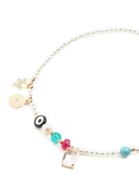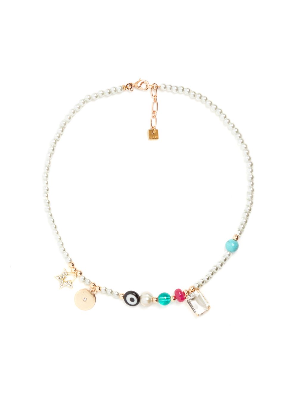 PERLINE BIANCHE E PENDENTI DI VARIE FORME E COLORI COMPONGONO LA COLLANA GIROCOLLO DI NAL? CHE SPICCHER? SU CAMICETTE E T-SHIRT. E' DOTATA DI MOSCHETTONE CON CHIUSURA REGOLABILE.