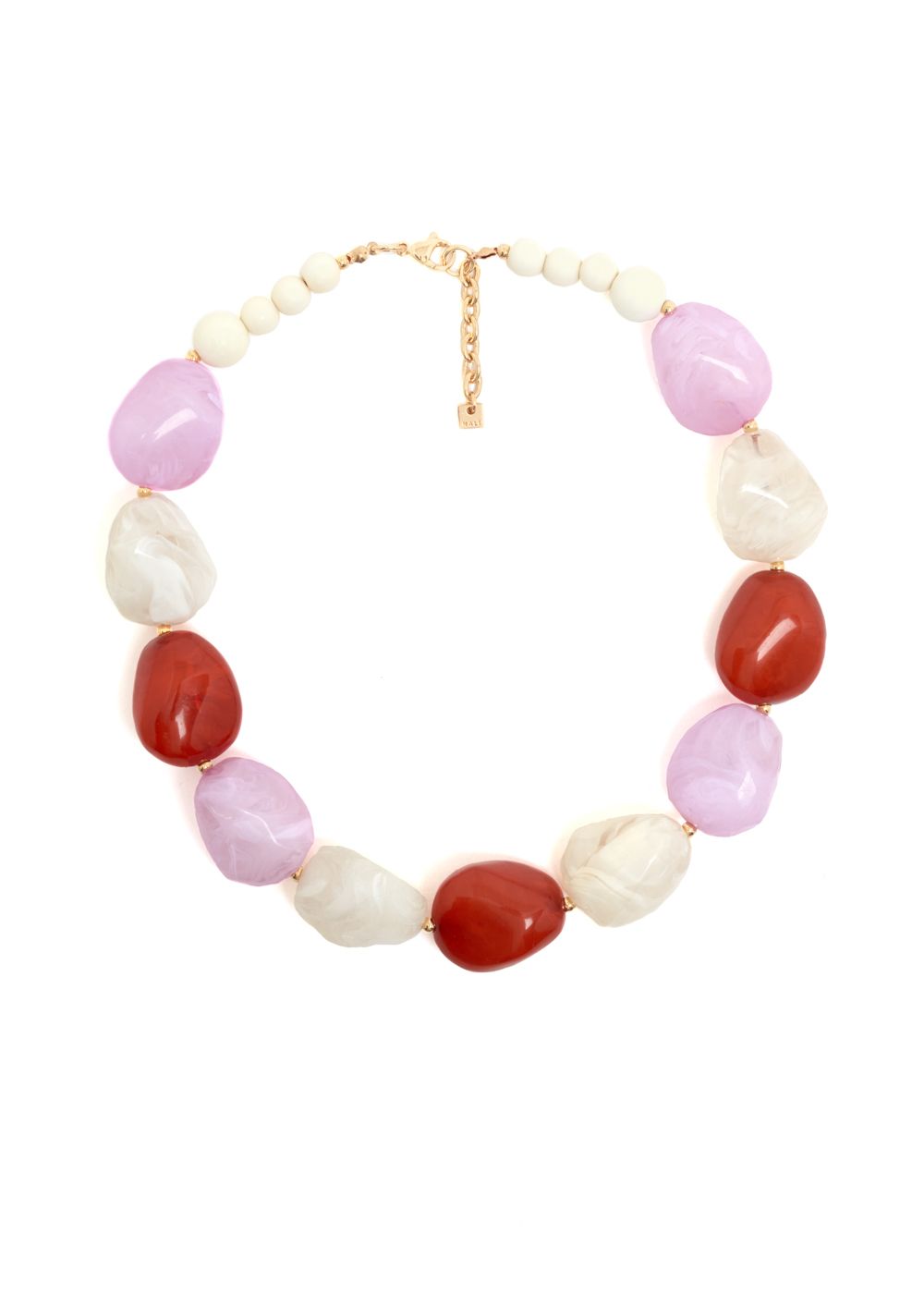 LA COLLANA A GIROCOLLO NAL? CON PIETRE SAGOMATE IN RESINA BIANCA, ARANCIONE E LILLA ? UN ACCESSORIO DAVVERO GLAMOROUS E ORIGINALE PER SCUOTERE UN LOOK CASUAL. E' COMPLETA DI MOSCHETTONE E CHIUSURA REGOLABILE.