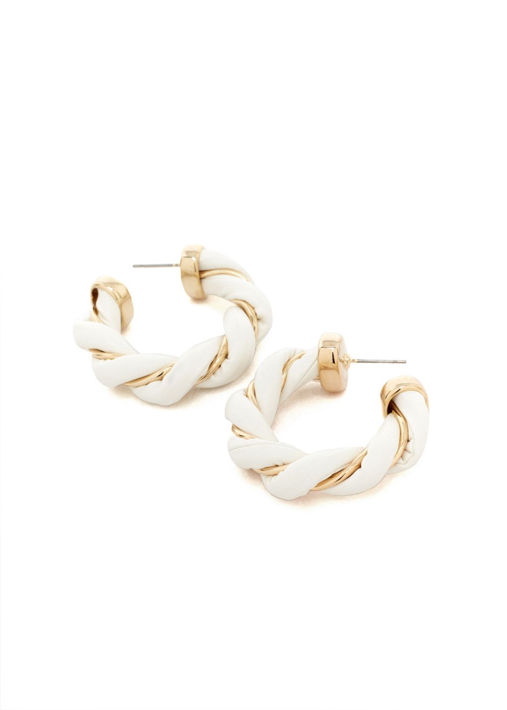 GLI ORECCHINI A CERCHIO NELLO STILE NEO-CHIC SI VESTONO DI LUSSUOSA NAPPA BIANCA E PLACCATI ORO 14K. UN GIOIELLO CONTEMPORANEO, DA ACCOMPAGNARE ANCHE AL GUSTO CLASSICO DI UN DOLCEVITA NERO. DOTATI DI CHIUSURA A FARFALLINA.
