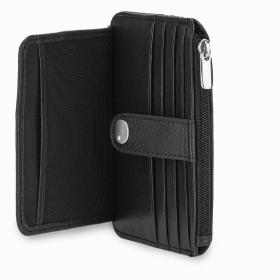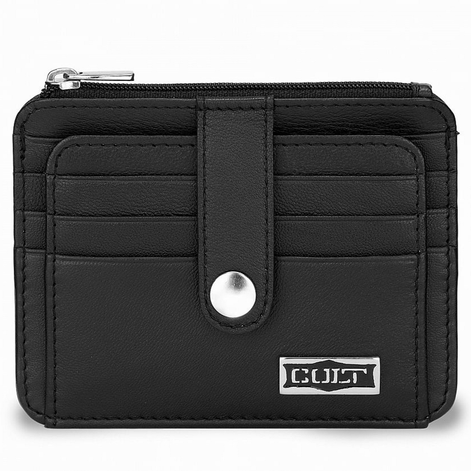 Portafoglio firmato Cult con logo nella parte frontale. Al suo interno ed esterno sono presenti piu' scomparti per organizzare banconote, tessere e monete, doppia chiusura tramite zip e bottone a pressione. Dimensioni 10x12