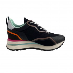 SCARPE SNEAKERS DONNA BLAUER CASUAL SPORTIVE IN TESSUTO E PELLE NERA CON DETTAGLI MULTICOLOR. MODELLO MARPLE CON FONDO IN GOMMA CON RIALZO.