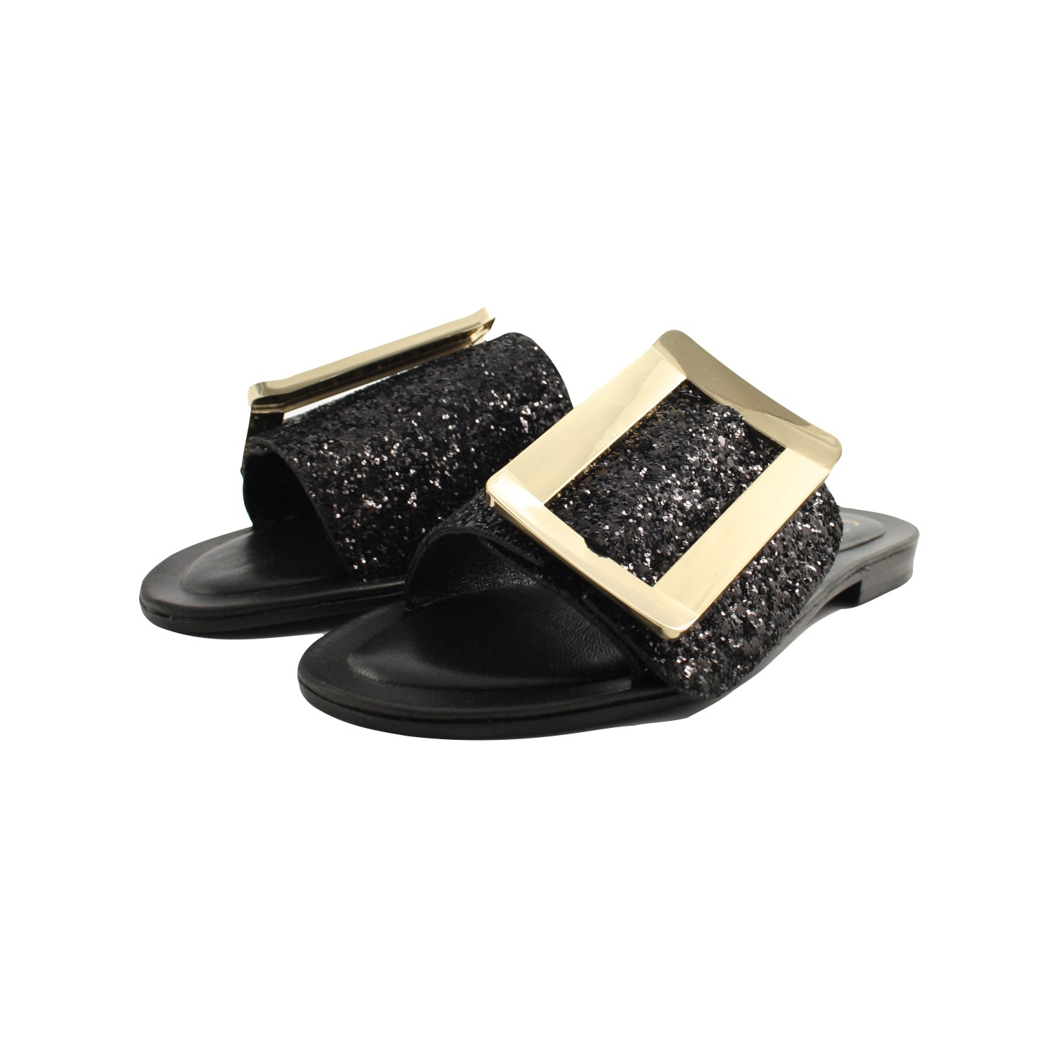 SANDALI CIABATTE MODA DONNA CE'CILE IN PELLE NERA CON FIBBIA DORATA.