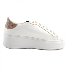 SCARPE SNEAKERS CASUAL GIOPIU DONNA IN PELLE BIANCA CON SCRITTE E PATCH APPLICATI SULLA TOMAIA. FONDO IN GOMMA ANTISCIVOLO.