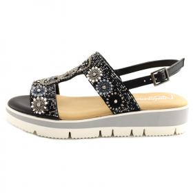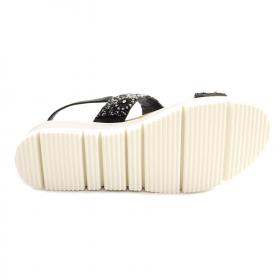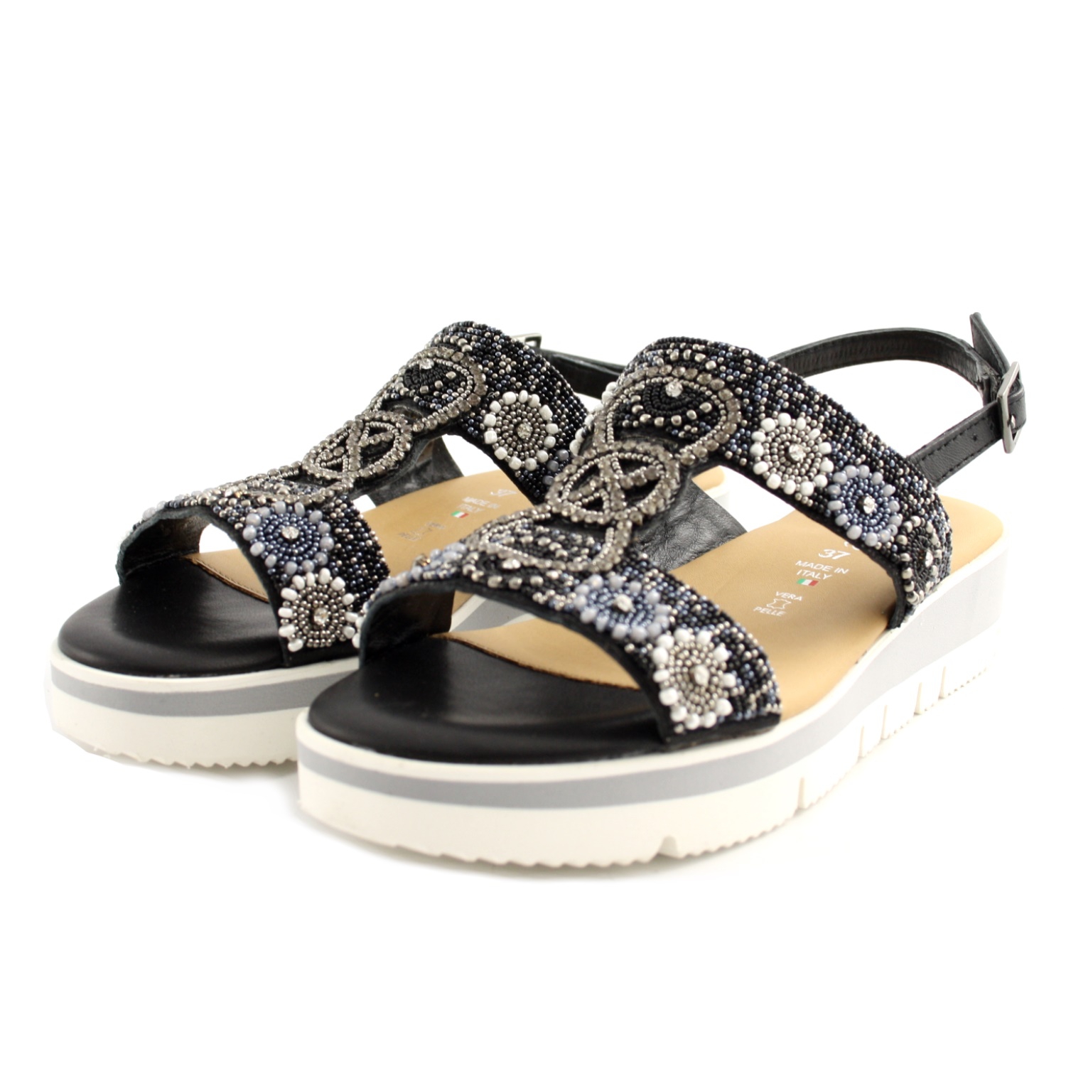 SANDALI DONNA MELEGANCE IN PELLE NERA CON PERLINE ETNICHE. CHIUSURA CON CINTURINO AL TALLONE. FONDO IN GOMMA ANTISCIVOLO.