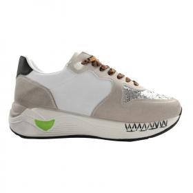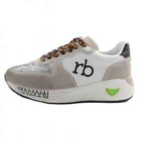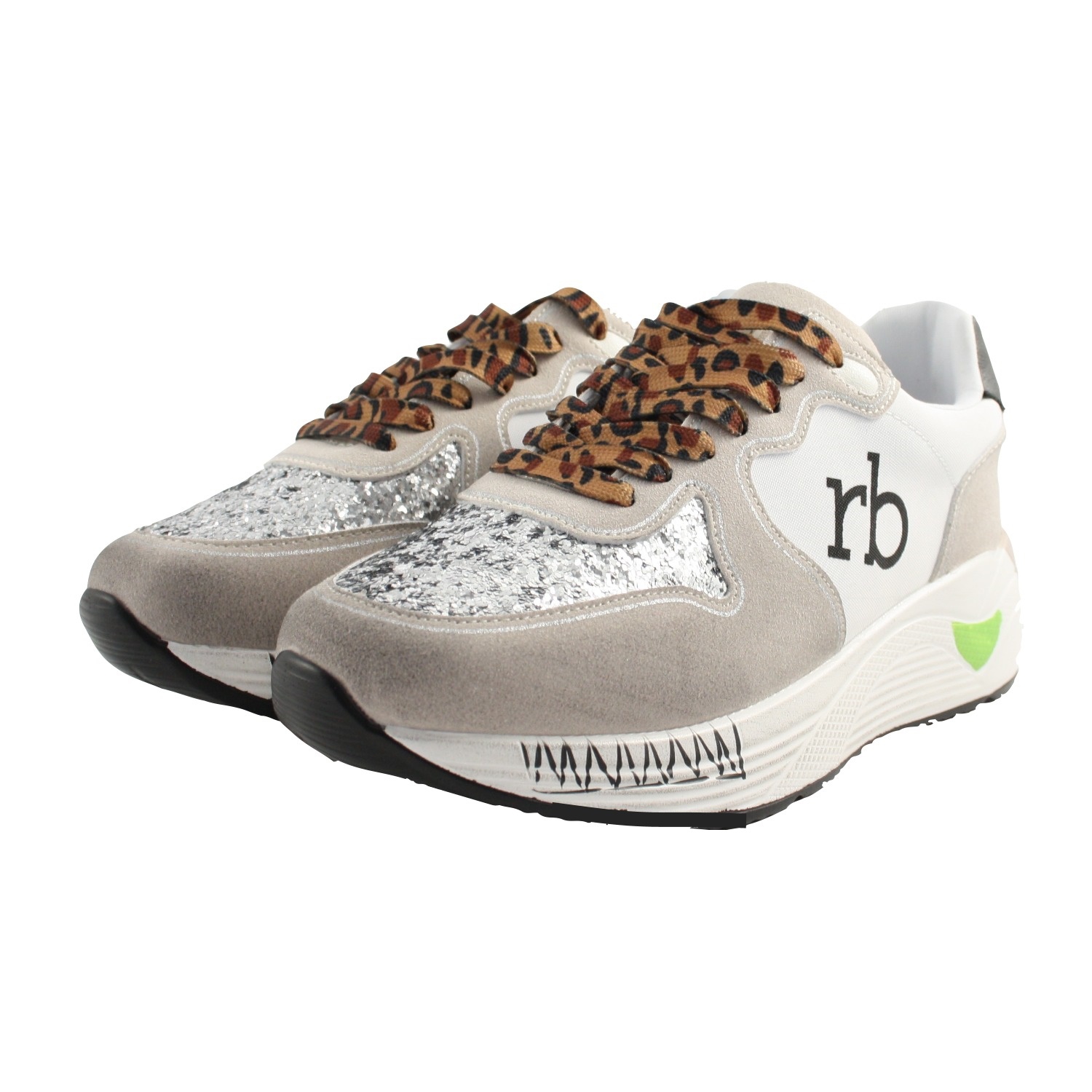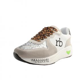SCARPE SNEAKERS ROCCOBAROCCO DONNA IN CAMOSCIO BEIGE, TESSUTO BIANCO E DETTAGLI LEOPARDATI. FONDO IN GOMMA ANTISCIVOLO CON RIALZO.