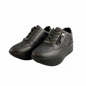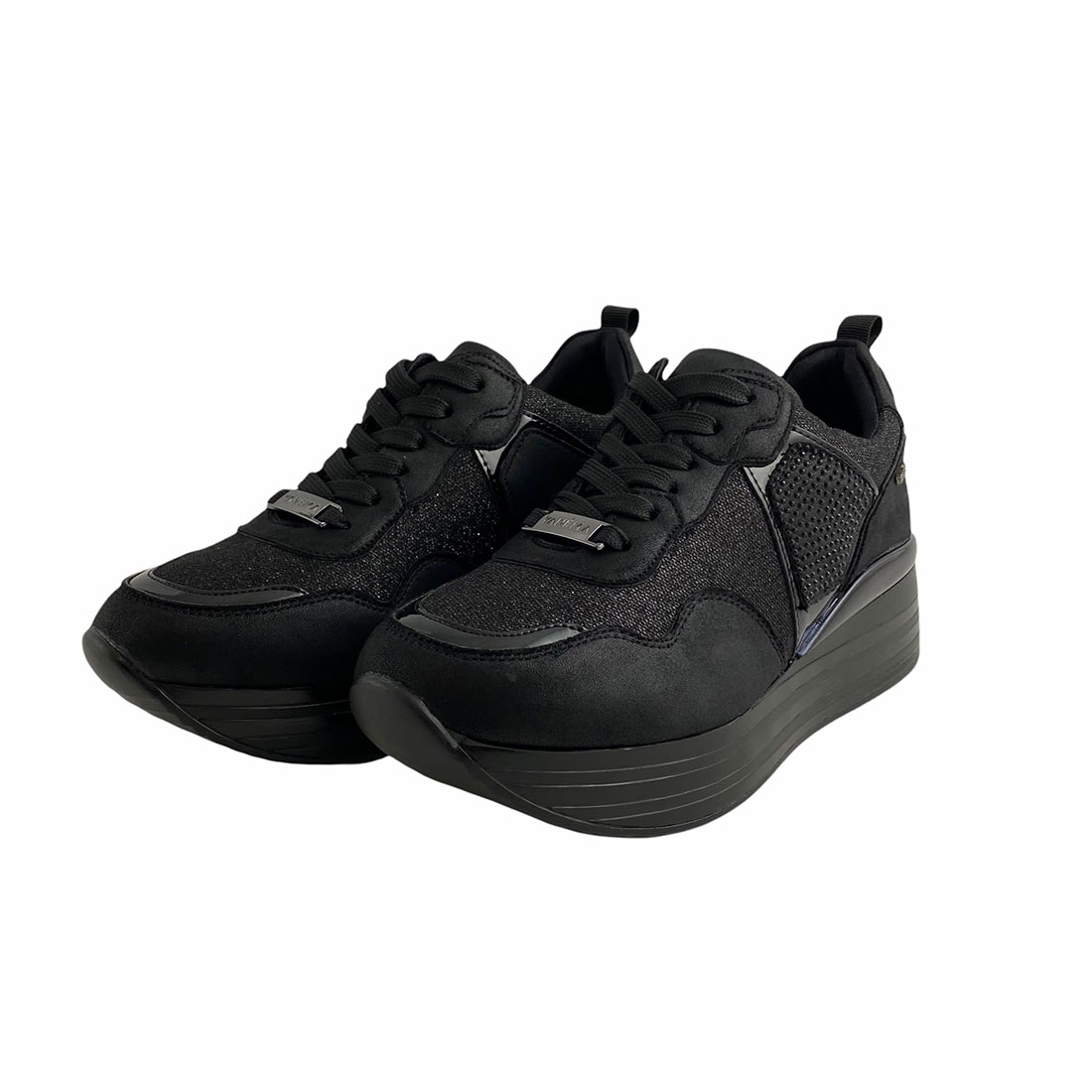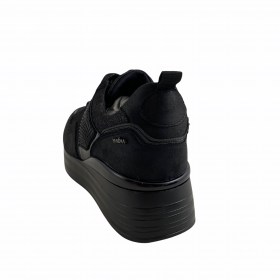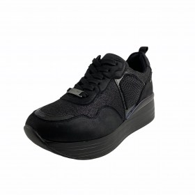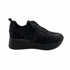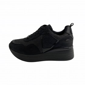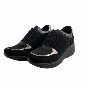 SNEAKERS CASUAL DONNA YANE'MA IN PELLE E TESSUTO ELASTICO NERO. MODELLO SLIPON CON STRASS DECORATIVI SULLA TOMAIA. FONDO IN GOMMA CON RIALZO.